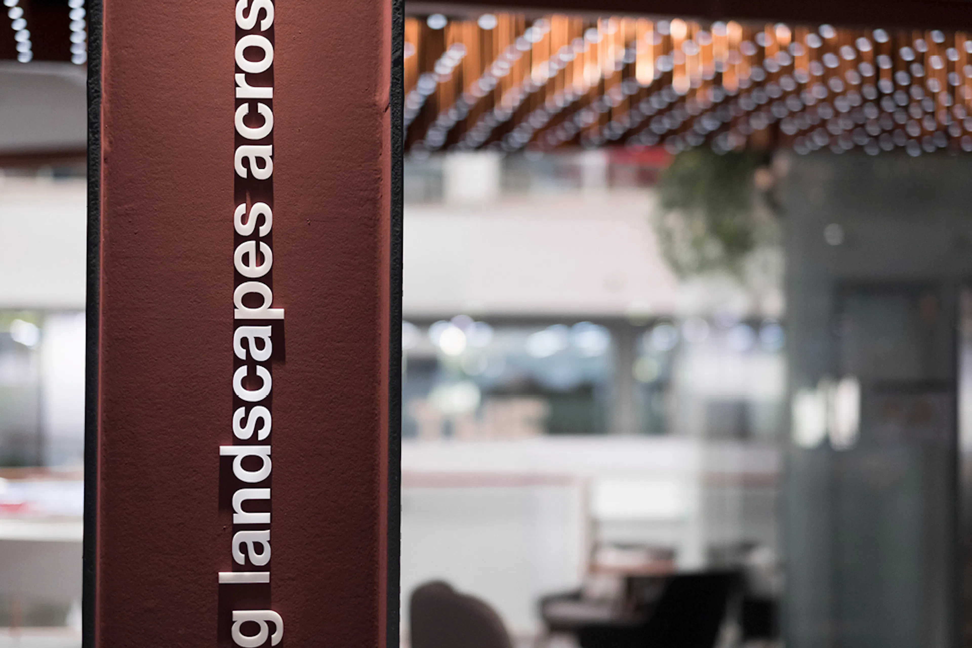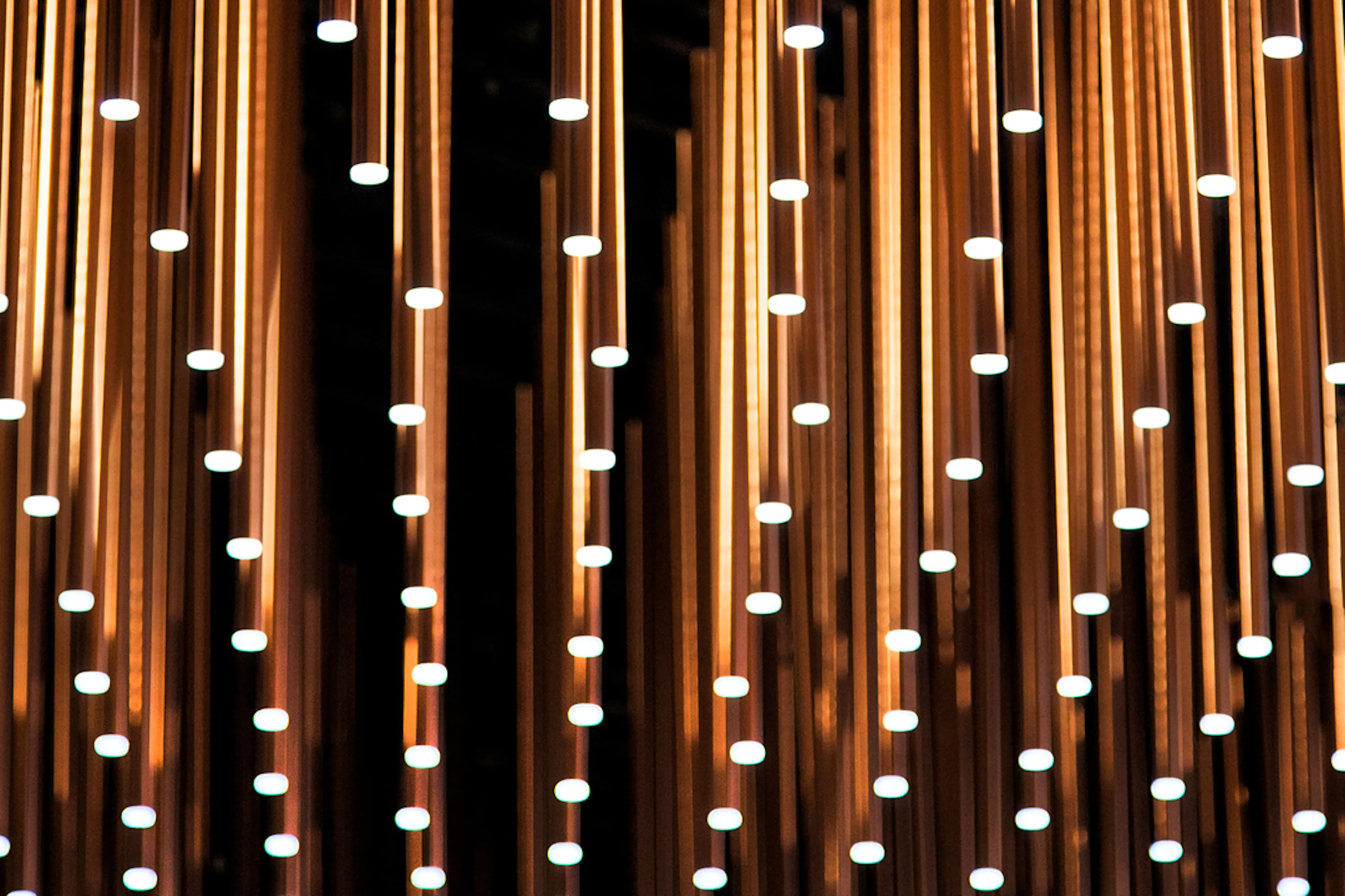TBE - The epicentre of our proposal was to celebrate the visionary, the art of dreaming and thus create a truly ethereal space. Accomplishing this meant every single element was bespoke. 5.3k of hand cut, hand finished copper rods of differing lengths were suspended from 4km of framework below undulating MEP. Each fitted with a precisely mounted, controllable LED slowly chasing in unison like wind blowing an oasis reed bed. We contoured the entire building in 2km of custom LED that settled the newcomer into its premium neighbourhood. Five faceted Corian plinths dance through the space and bestow a wealth of custom content taking months to sort and assemble, each piece meticulously identified by hand and planned in 2D & 3D software ensuring the perfect narrative and placement.The plinths were encompassed by hand painted tension-controlled string walls broadcasting brand-centric messages that manifest themselves into and out of visibility like quantum strings. Additionally hundreds of stained, printed ply slats and meticulous string sculptures/ infographics tell the tale of local and global economic diversification.